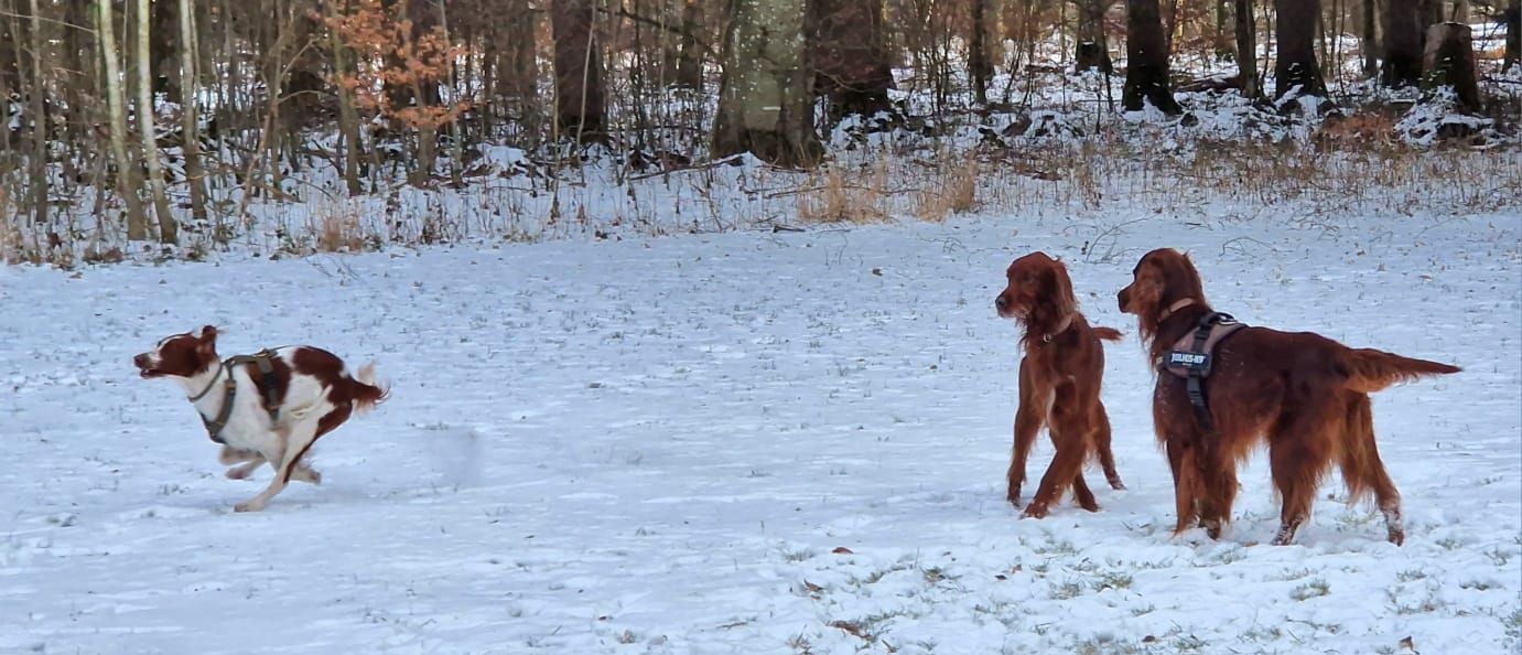 Als wir an der Jagdhütte ankamen, wurden wir von Andreas Straub mit Glühwein, Tee und sonstigen Getränken in Empfang genommen und für die Hunde hieß es "Leinen los" und sie konnten ausgiebig toben und es war einfach schön zu sehen, wie verträglich unsere Setter doch sind und da wir und unsere Vierbeiner ja bestens sozialisiert sind, hat es auch mit den Hunden der anderen Rassen die dabei waren, bestens harmoniert.